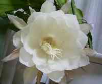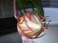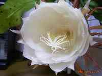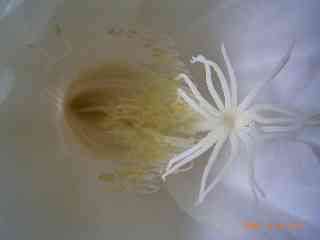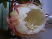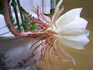 ところが、残念ながら月下美人は自家受粉はできないとのこと、すなわち同じ株の花粉を雌しべにつけても実ができない(これを自家不和合というそうです)とのことです。では別の株ならいいのか。しかし、これもだめのようです。なぜなら日本や東南アジアの月下美人はほとんどが同じ遺伝子をもっている、つまり、一本の株から挿木で増やされて広がってきたので遺伝的に全く同じ(この場合も自家不和合が働きます)だそうです。なんでも、財団法人進化生物学研究所(東京)の湯浅浩史主任研究員(細胞遺伝学・育種学)の研究によれば、日本の月下美人は、原産国メキシコから16〜7世紀にフィリピンに伝えられ、そこから東南アジアや台湾に伝わり、大正か昭和のはじめに日本に入ったとのことです。この間ずっと挿し木によって増やされてきたというのだから驚きです(1996.07.02 朝日新聞朝刊)(→http://www.interq.or.jp/ox/amv/e21ge.html)
