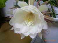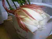 平成16年になって、6月に花芽がいくつか出てきました。そのうちの1つがどんどん大きくなり、ついに6月22日の夜見事に咲きました。これが我が家での最初の開花です。ただ、このときはあいにく夜遅く帰宅したため、開ききったものしか見ることができませんでした。