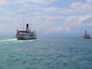 乗ってきた船(左)が引き返して行くのと入れ違いに,モントルー行きの船(右)が近づいてきました。