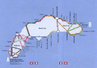 残念ながら,モントルーへの直行便はこのときは運行されていなかったので,途中で別の船に乗り換えなければなりませんでした。少し見難いですが,A地点がジュネーブ,B地点がモントルーです。